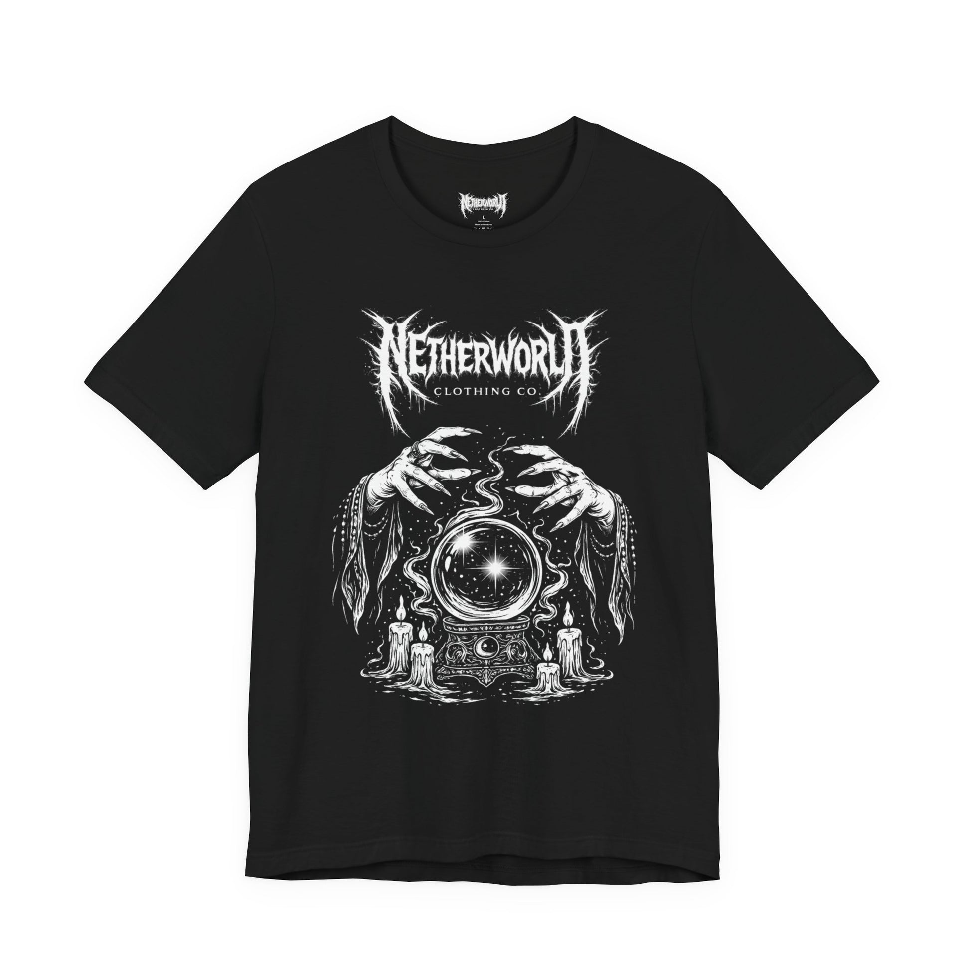 Lightweight cotton, heavy intent. A dark mythic design forged for those who see beyond the surface. Veil of the Oracle blends ancient prophecy with modern power, revealing a sacred presence hidden in shadow and symbol. Stark white linework cuts through a deep black void, forming arcane shapes, ritual geometry, and ominous iconography that feel both timeless and forbidden.